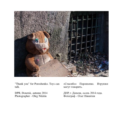 "Thank you" for Poroshenko. Toys can «Спасибо» Порошенко. Игрушки talk. могут говорить. DPR, Donetsk, autumn 2014 ДНР, г. Донецк, осень 2014 года. Photographer - Oleg Nikitin Фотограф - Олег Никитин