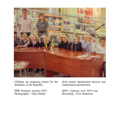 Children are preparing letters for the Дети пишут фронтовые письма для defenders of the Republic. защитников республики. DPR, Donetsk, summer 2015 ДНР, г. Донецк, лето 2015 года. Photographer - Oleg Nikitin Фотограф - Олег Никитин