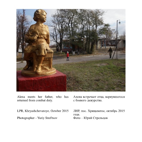 Alena meets her father, who has Алена встречает отца, вернувшегося returned from combat duty. с боевого дежурства. LPR, Khryashchevatoye, October 2015 ЛНР, пос. Хрящеватое, октябрь 2015 года. Photographer - Yuriy Strel'tsov Фото – Юрий Стрельцов